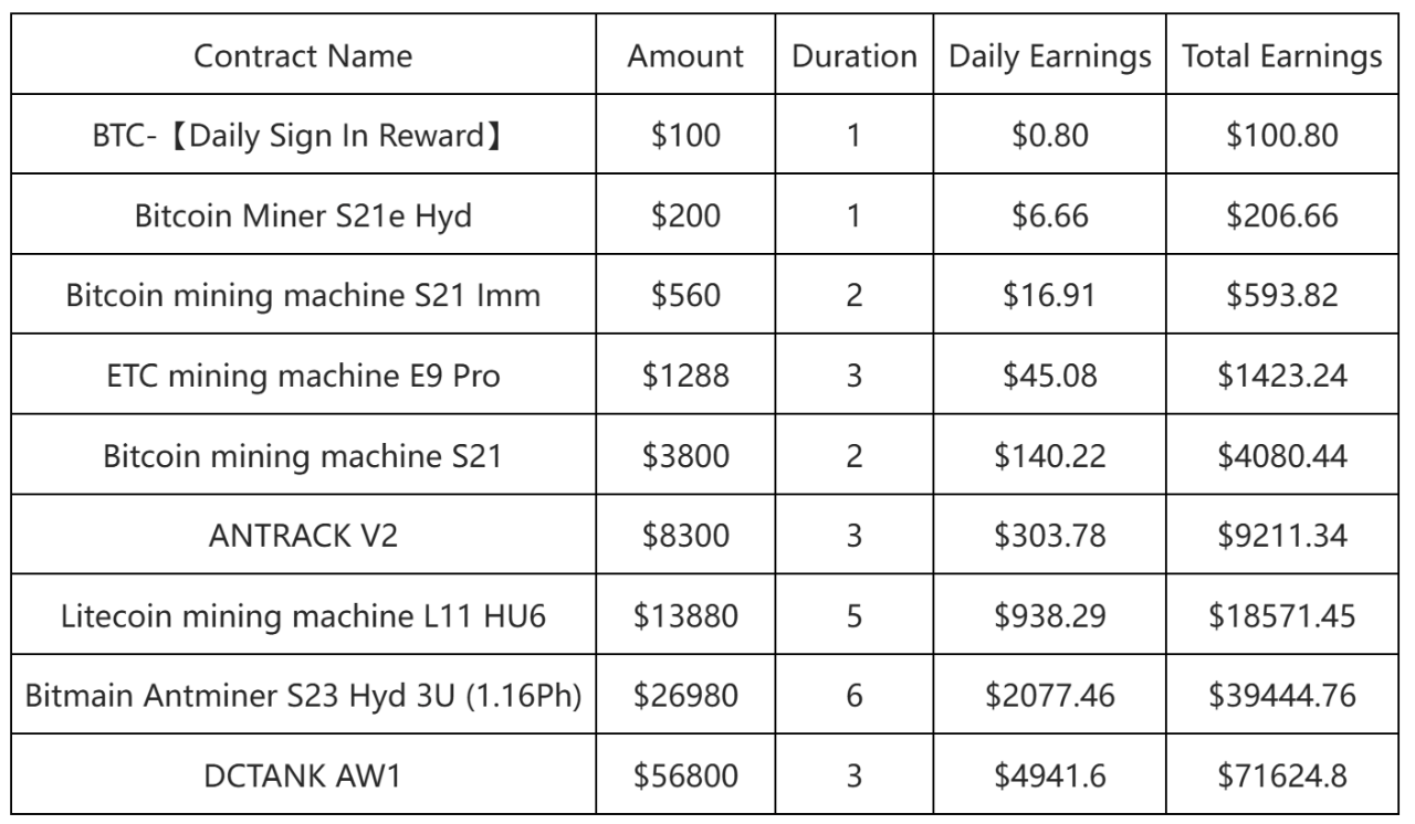 DefiMiner offers a variety of flexible mining contracts with a low daily spending threshold, suitable for users with different budgets—a premium choice worth trying. Available Contracts: