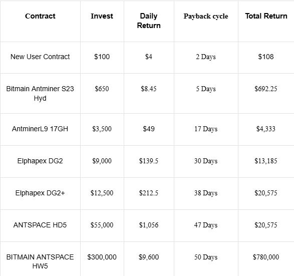 Choose from a Variety of Contracts: GoldenMining offers contracts suited for both short-term and long-term investors, with diverse options to choose from.