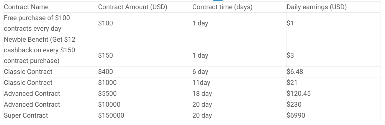 Contracts go live immediately after purchase and begin generating rewards the following day. Users can withdraw once their account balance reaches $150 or re-invest into additional contracts.